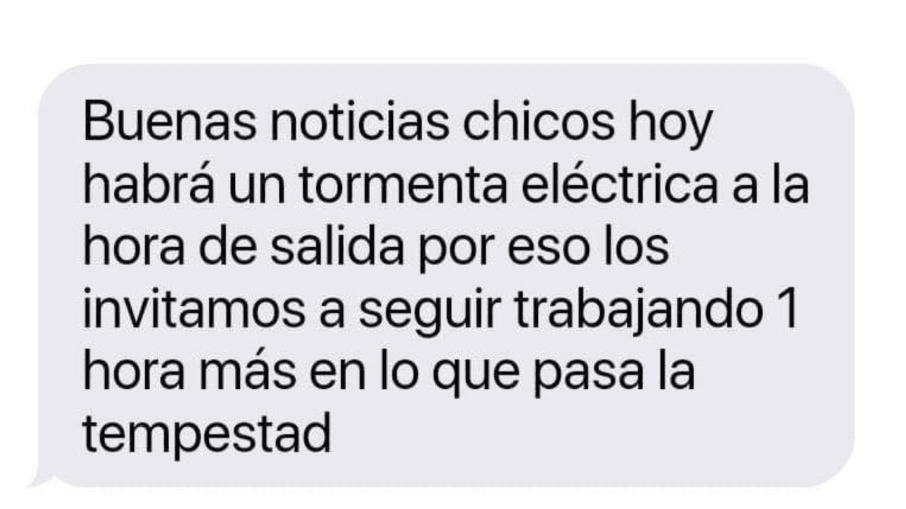 En Facebook también se hicieron presentes algunos casos parecidos. La página ‘Solo en México’ compartió la captura de pantalla de un mensaje que un supervisor habría mandado a sus empleados: “Buenas noticias, chicos, hoy habrá una tormenta eléctrica, por eso los invitamos a seguir trabajando 1 hora más en lo que pasa la tempestad”. No encontramos “bueno” de ese mensaje.