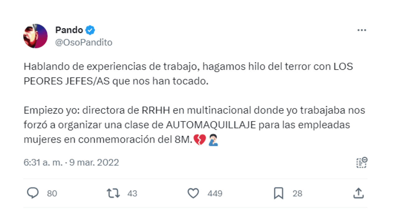 El 9 de marzo del 2022, el usuario ‘OsoPandito’ pidió en Twitter que otros usuarios compartieran sus anécdotas con “los peores jefes” con los que habían podido trabajar. Las respuestas fueron de lo más aterradoras.
