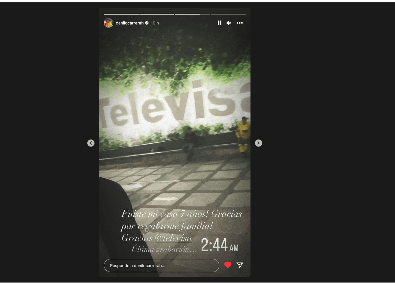 A través de una imagen de las instalaciones de Televisa San Ángel que el actor compartió en sus historias de Instagram, el actor lanzó un conmovedor mensaje: "Fuiste mi casa 7 años. Gracias por regalarme familia. Gracias Televisa. Última grabación...", se lee. Acompañado de este texto, Danilo puso la hora en la que se despidió oficialmente del lugar que le dio tanto, las 2:44 de la mañana.