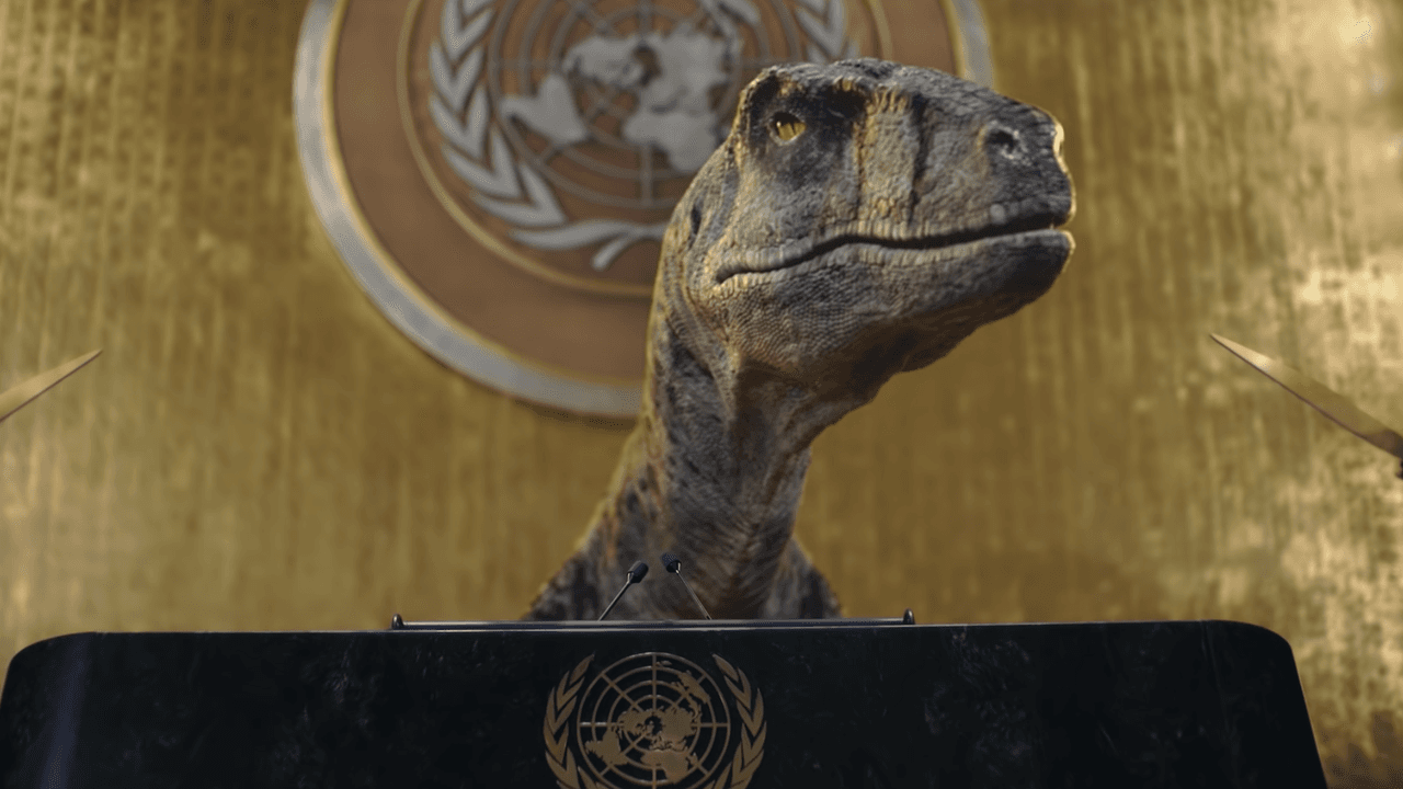 Dinosaurio ‘regaña’ y lanza poderosa advertencia a la humanidad en la ONU: “No elijan la extinción”