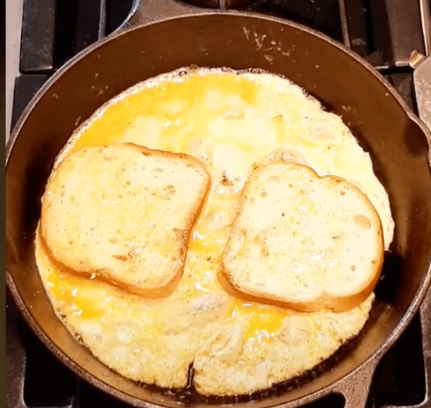 - Espera a que el huevo se vea cocinado, y voltéalo (con todo y panes).
