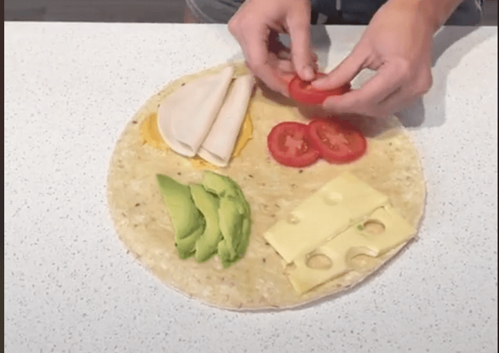 Necesitas: Tortilla de harina grande o pan árabe y cuatro ingredientes de tu preferencia (en este ejemplo se usa jamón, aguacate, jitomate y queso).