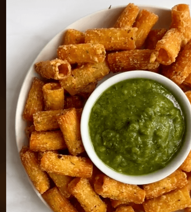 Necesitas: Pasta corta (la que prefieras), aceite de oliva, sal, hierbas finas, queso parmesano, salsa de tu elección y una freidora de aire (si no tienes puedes freírlas en un sartén con aceite como se hace de manera tradicional).