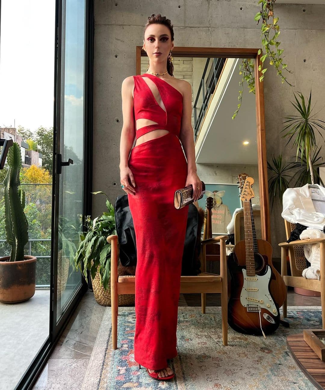 Se trata de un vestido rojo, ajustado, con aberturas en la parte del abdomen y del pecho y el hombro, el cual combinó con un elegante bolso tipo clutch y complementó con un peinado recogido y un maquillaje ad hoc al color de su atuendo.