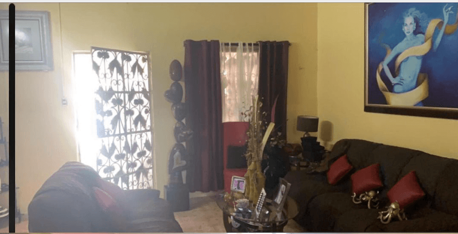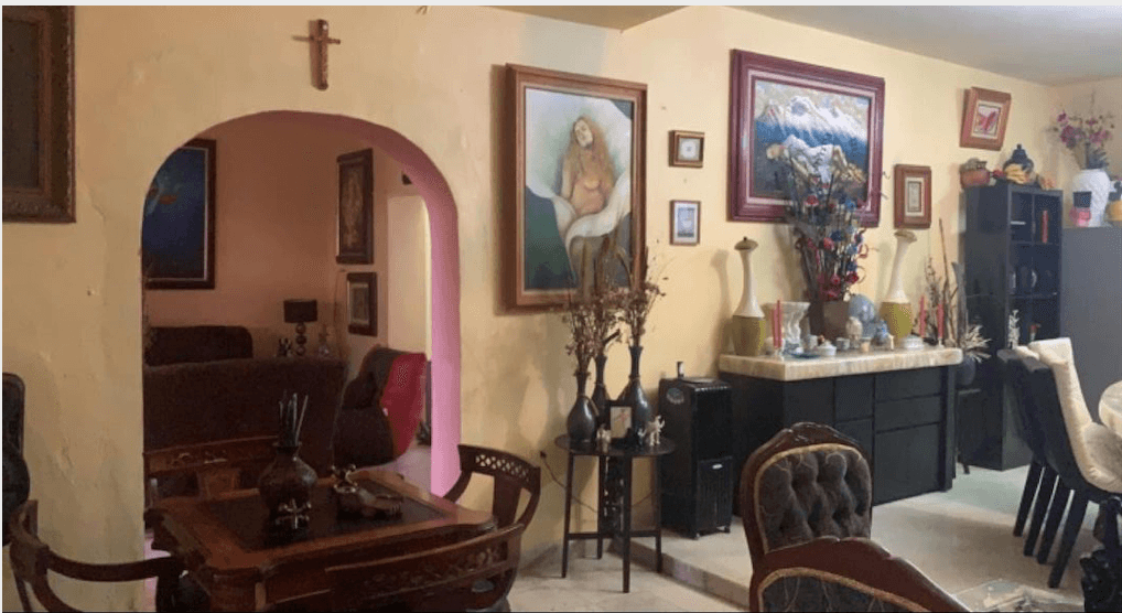 1) La estancia: La planta baja de la morada es bastante amplia, pudiéndose apreciar que la actriz decoró esa área con un comedor, una pequeña mesa de juego, y algunos crucifijos y pinturas, siendo un cuadro de ella saliendo de un alcatraz uno de los principales.