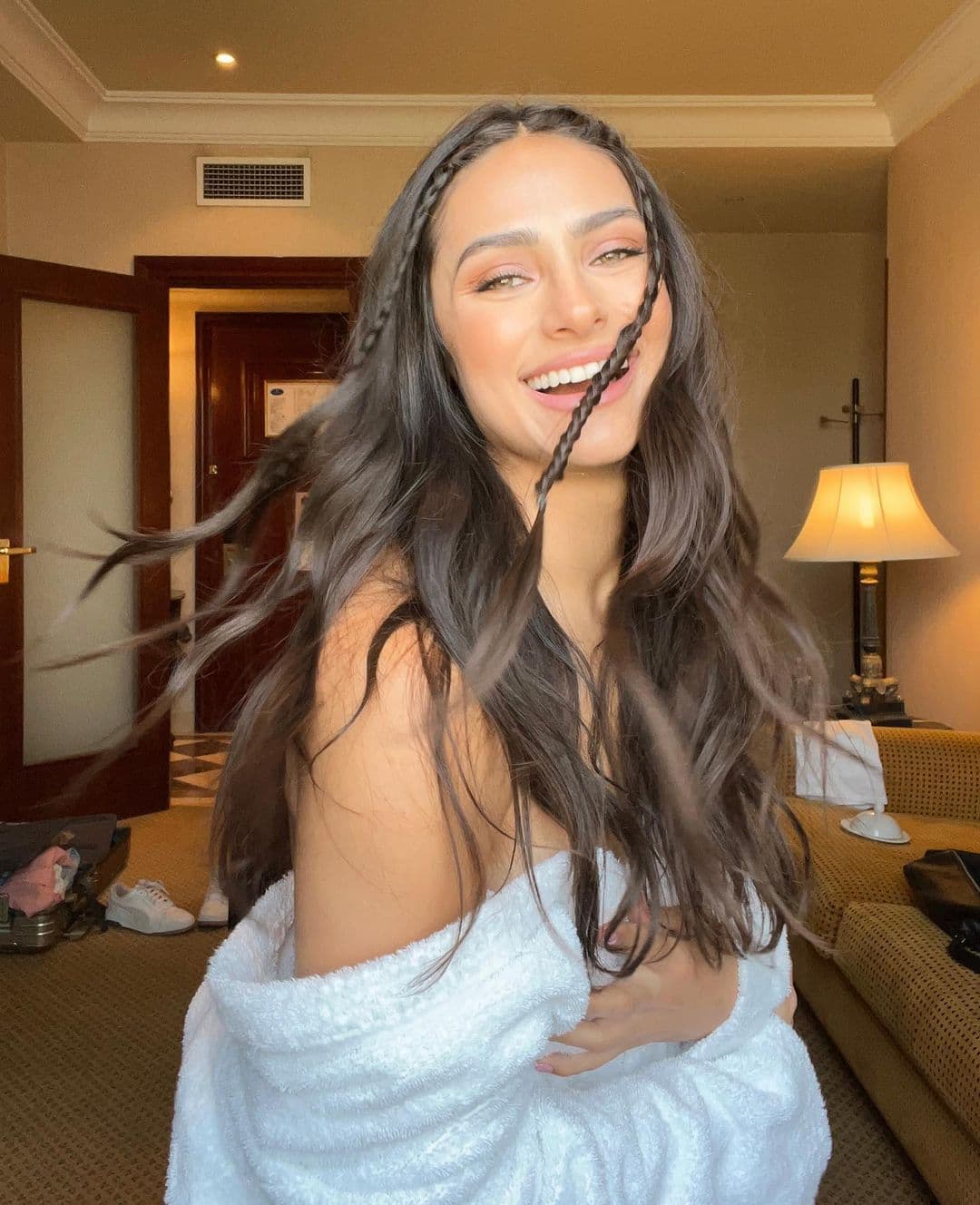 Sin embargo, en las últimas horas volvió a causar revuelo al compartir un par de imágenes en las que su único outfit es una bata de baño blanca que complementó con un peinado de cabello suelto con trenzas y un maquillaje terroso.