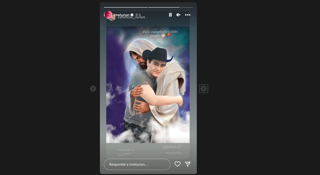Una de las imágenes que más conmocionó al público fue la que la también mamá del hijo de Julián compartió en sus historias de Instagram. Ésta refiere a una foto editada por un fan en la que se ve a Julián abrazar a Jesucristo. Ésta, Imelda la acompañó de las tiernas palabras: "Feliz cumpleaños niño guapo".