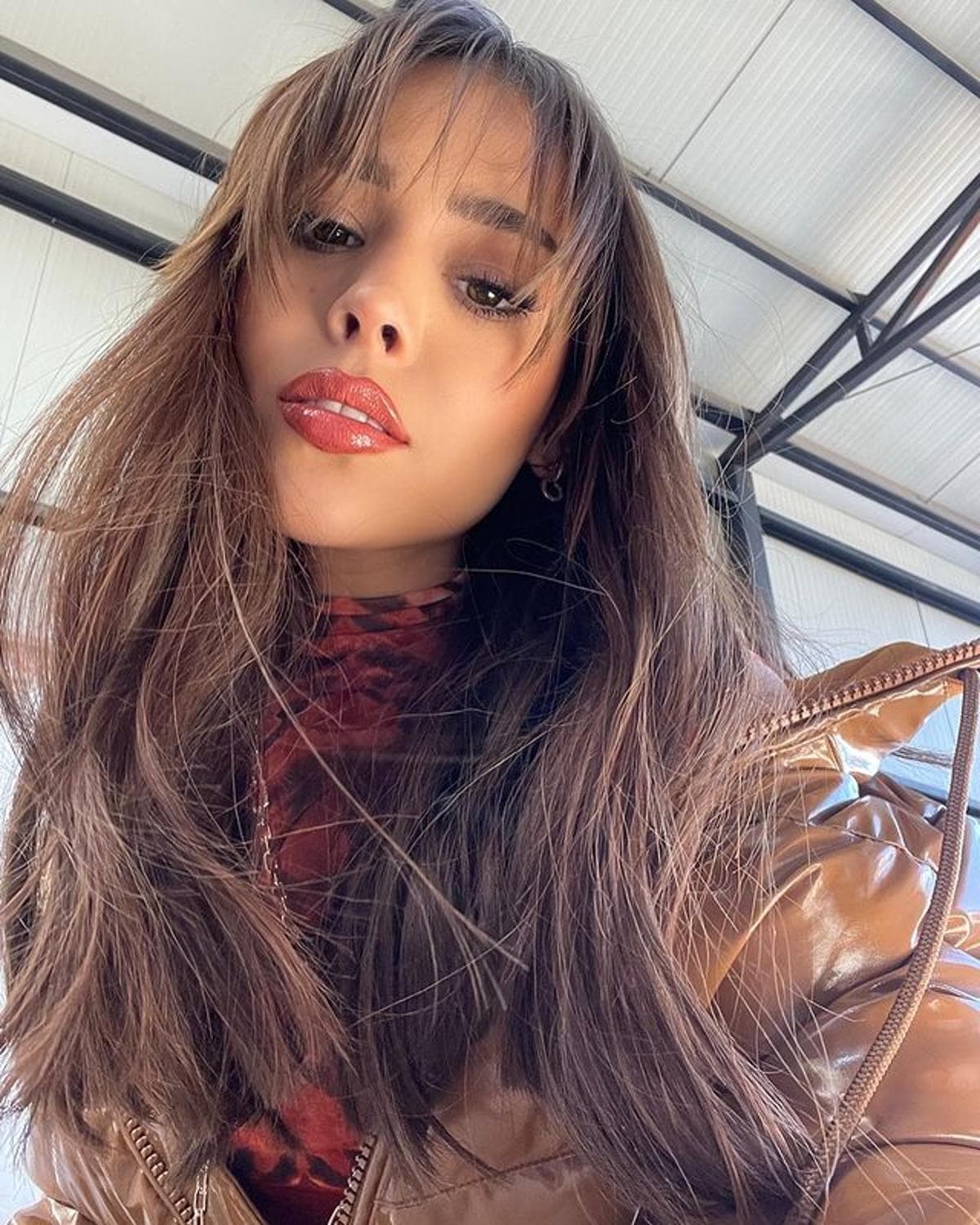La joven de 26 años complementó todo el atuendo con un maquillaje mate, labios definidos en color café y un delineado gráfico en magenta.