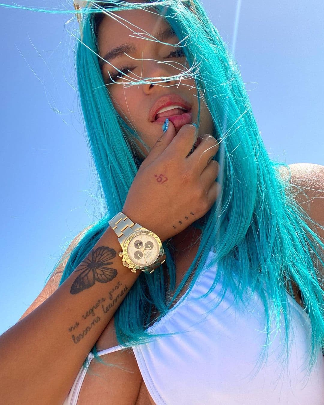 5) Los números '1991' y '+57': En su mano se puede apreciar que la Bichota tatuó estos dos números, siendo el primero el relativo a su año de nacimientoy, el segundo, al prefijo númerico de su natal Colombia. Recientemente, también incorporó el número '200' con motivo de su éxito '200 copas'.
