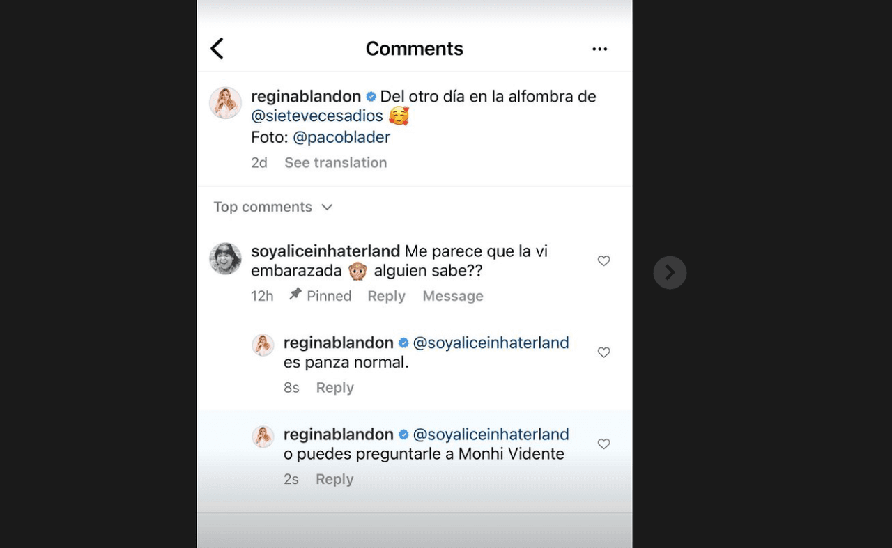 Dicho comentario, sugería que en la red carpet anteriormente mencionada, la actriz se veía "embarazada", por lo que la usuaria pedía al resto de los cibernautas confirmar si, en efecto, la actriz estaba esperando un hijo.