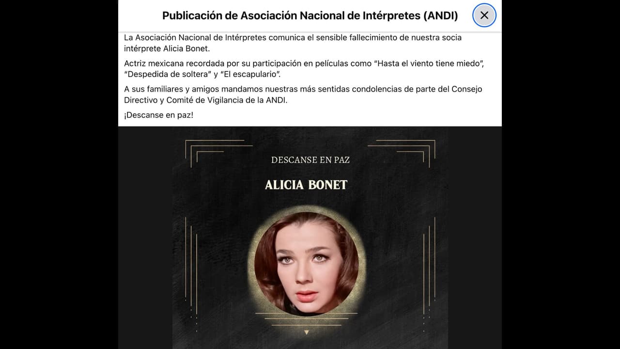 La Asociación Nacional de Intérpretes comunica el sensible fallecimiento de nuestra socia intérprete Alicia Bonet. Actriz mexicana recordada por su participación en películas como "Hasta el viento tiene miedo", "Despedida de soltera" y "El escapulario", se lee en la minuta.