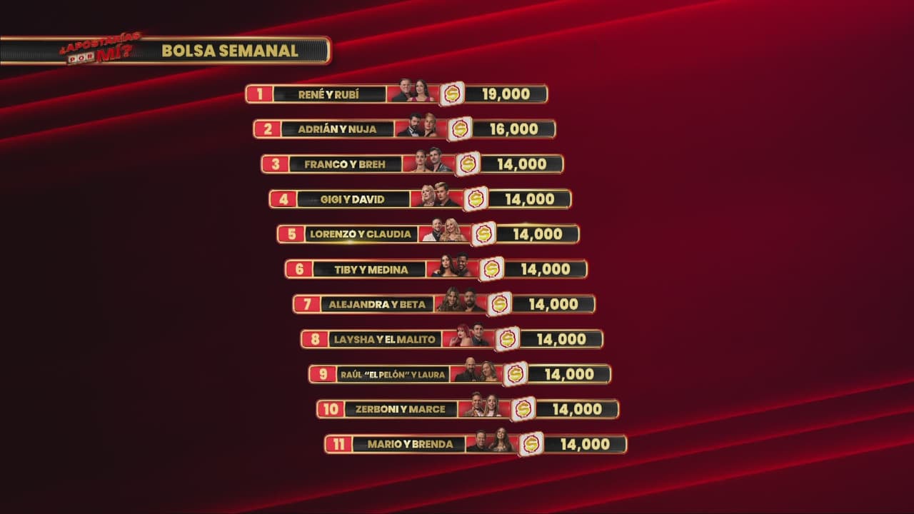Tras haber apostado mil dólares en el desafío de parejas y, además hacer sus apuestas cruzadas, esta es la cantidad con la que inician la semana los competidores: