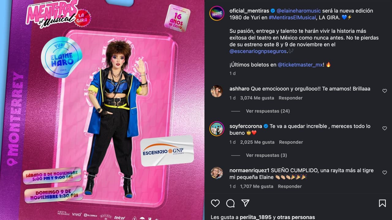 Elaine Haro será la nueva edición 1980 de Yuri en #MentirasElMusical, LA GIRA", se lee en su publicación.