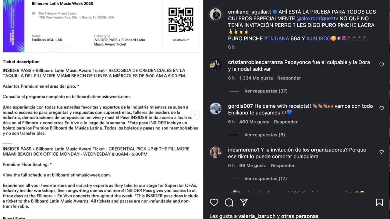 Emiliano Aguilar no se calla y muestra el boleto que le mandaron de los Billboards