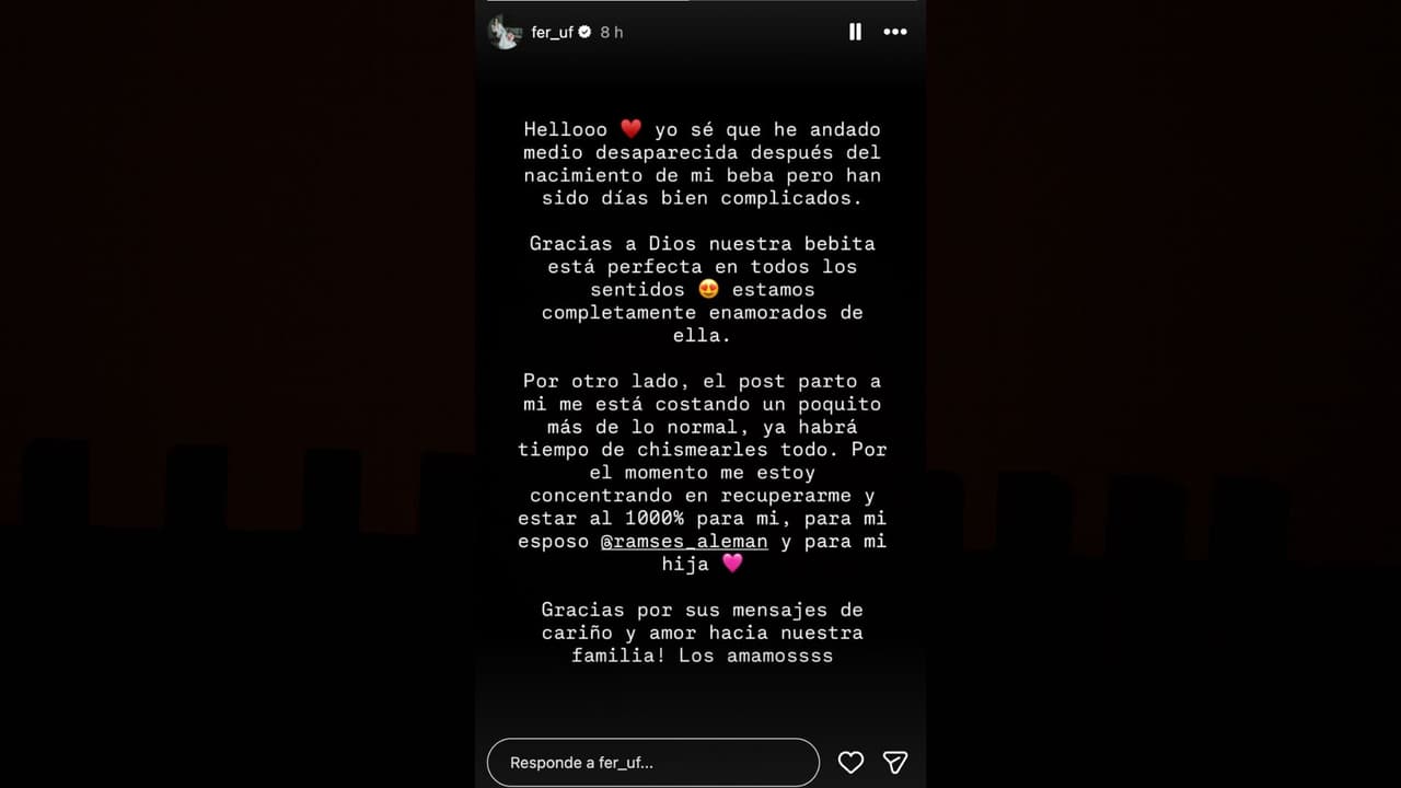 Desde el nacimiento de la pequeña, quien dio la feliz noticia fue Alemán, compartiendo con sus seguidores las primeras imágenes de la bebé mientras Urdapilleta seguía en la cama de hospital. Aunque también le dedicó unas palabras a su hija, la joven se ha alejado un poco de redes sociales.