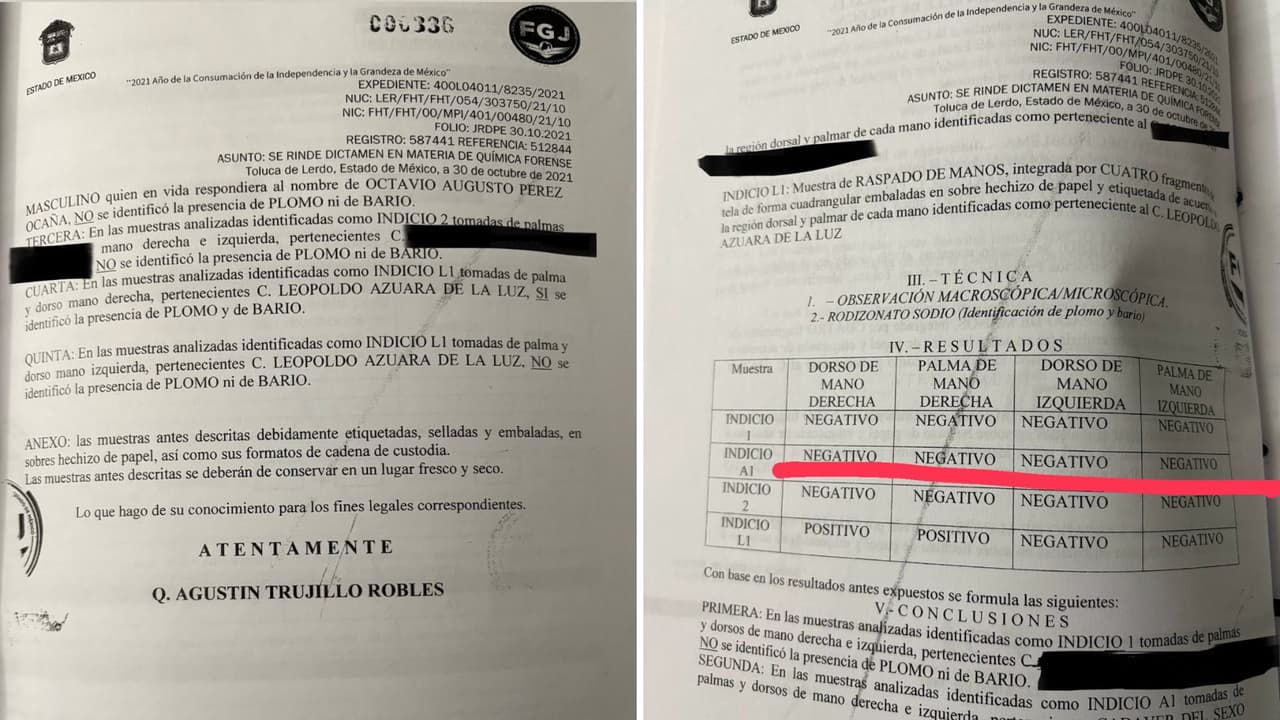 "En las muestras analizadas identificadas como indicio A1, tomadas de palmas y dorsos de mano derecha e izquierda pertenecientes al cadáver del sexo masculino quien en vida respondía al nombre de Octavio Augusto Pérez Ocaña, no se identificó la presencia de plomo ni de bario", señala el documento.