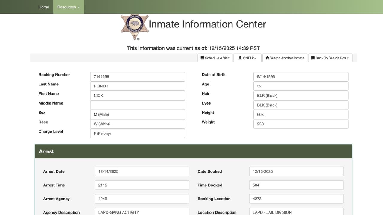 Este lunes 15 de diciembre se dio a conocer por las autoridades que Nick, hijo mediano de Rob y Michele Reiner, fue arrestado por ser el principal sospechoso del homicidio. En la ficha policial se señala que la detención fue por actividades delictivas relacionadas a pandillas, aunque no se señala el cargo.