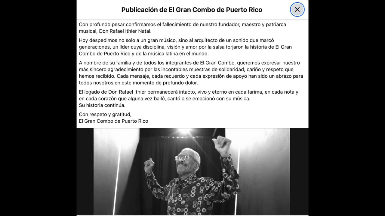 El mundo de la música se encuentra devastado tras darse a conocer la muerte de Rafael Ithier Natal, uno de los fundadores del Gran Combo de Puerto Rico, quien falleció el pasado sábado 6 de diciembre de 2025, a los 99 años.