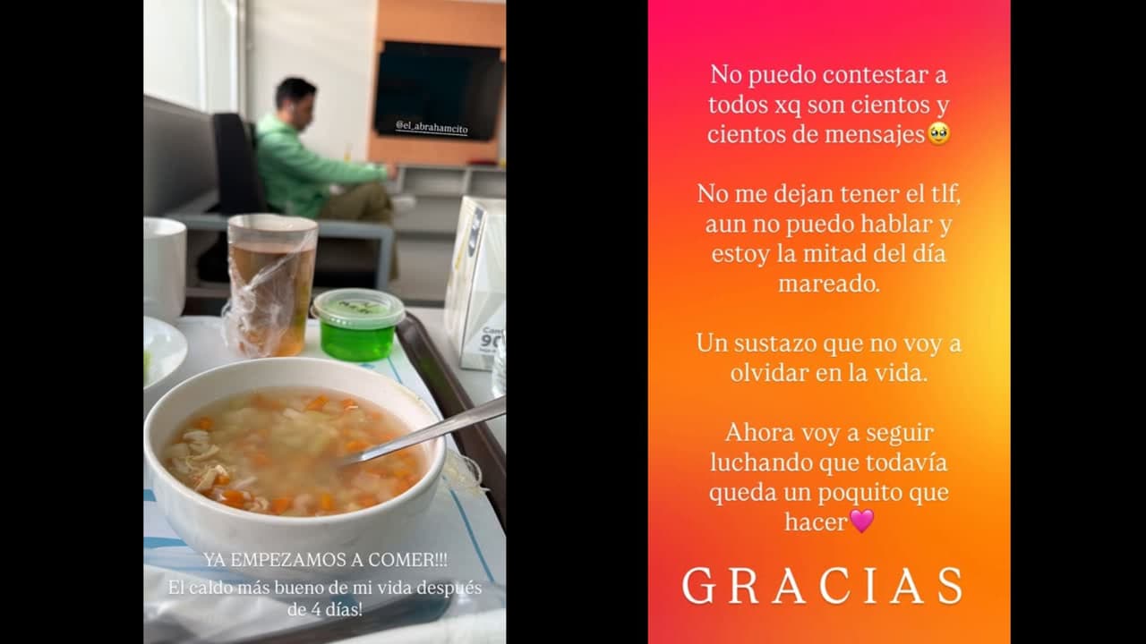 ¡¡¡YA EMPEZAMOS A COMER!!! El caldo más bueno de mi vida después de 4 días", se lee en una de sus historias de Instagram, donde al fondo sale su novio, Abraham.
