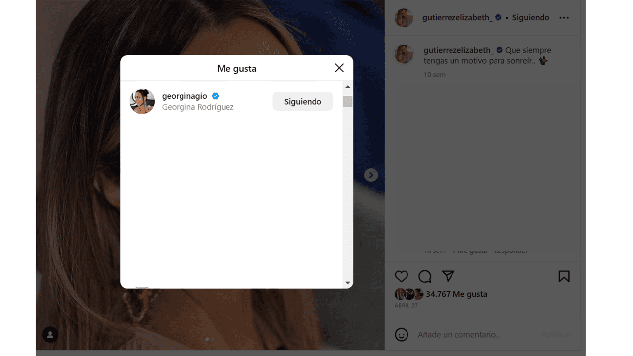 Debido a las restricciones de su perfil digital, no se pudo constatar si Georgina Rodríguez sigue a Elizabeth Gutiérrez en Instagram, aunque sí saltó a la luz el hecho de que esta no es la primera vez que ve sus publicaciones.