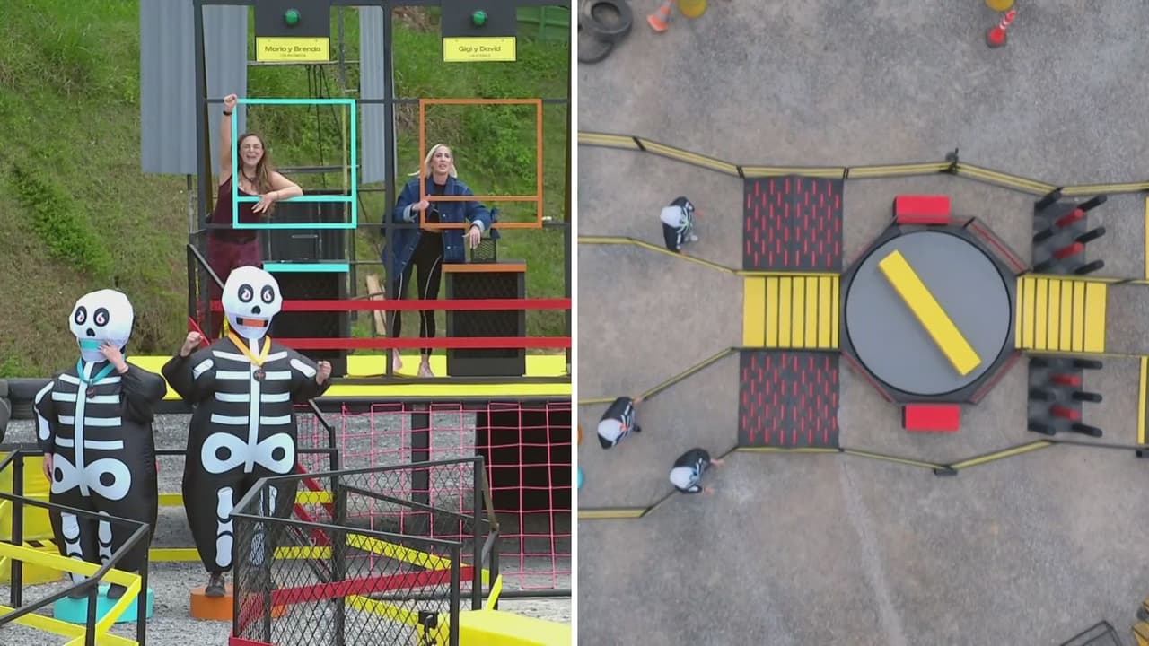 En la prueba llamada Carrera de Calacas, un integrante de la pareja recorrió un laberinto completamente a ciegas, usando un disfraz de calaca, mientras el otro, desde una plataforma elevada, lo guió únicamente con la voz entre obstáculos, escaleras, bloques en movimiento y trampas.